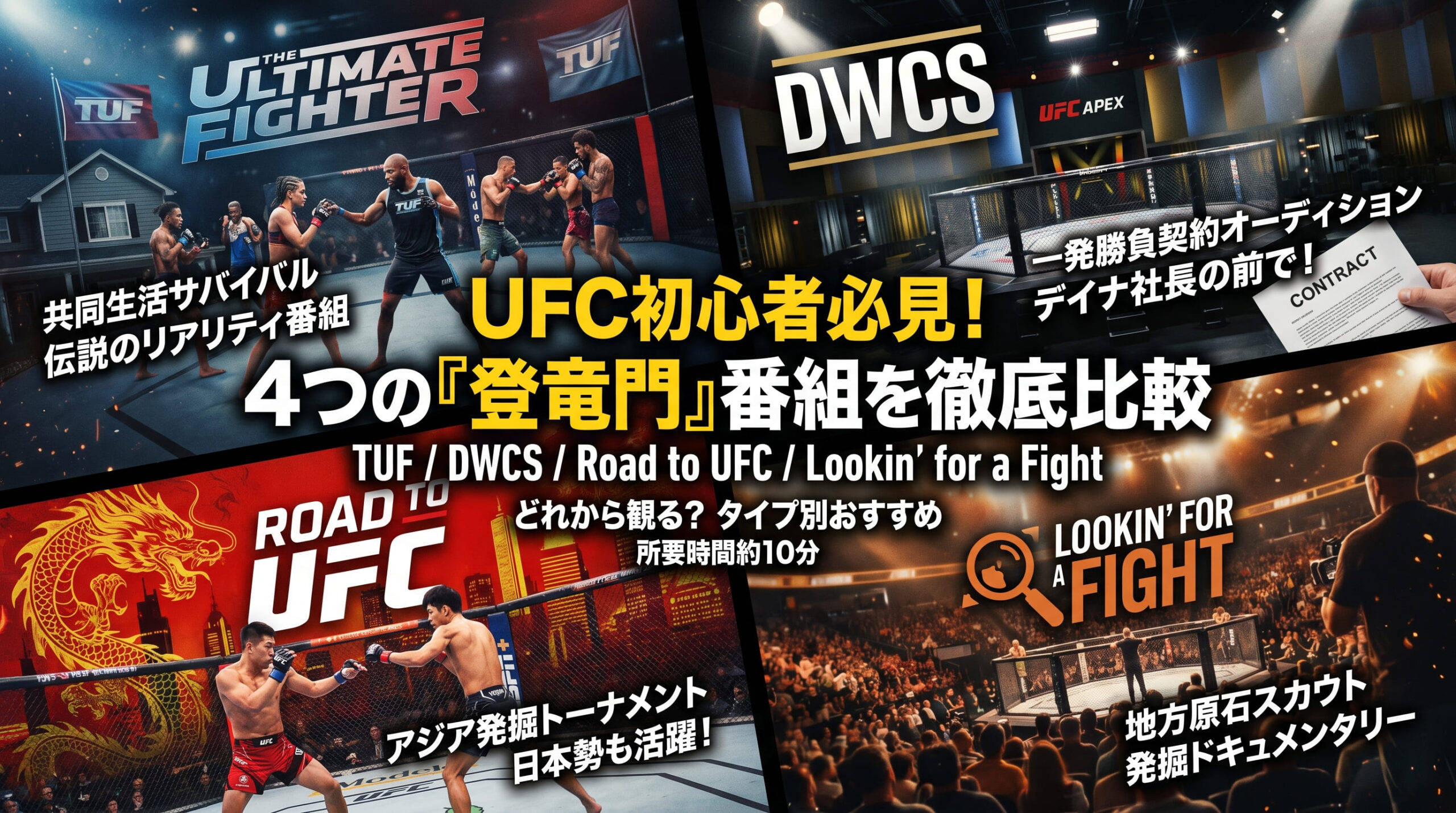 TUF・DWCS・Road to UFC・Lookin’ for a Fight。どれもUFCにつながる“入口”として面白いけど、役割も体験もそれぞれかなり違う番組です。